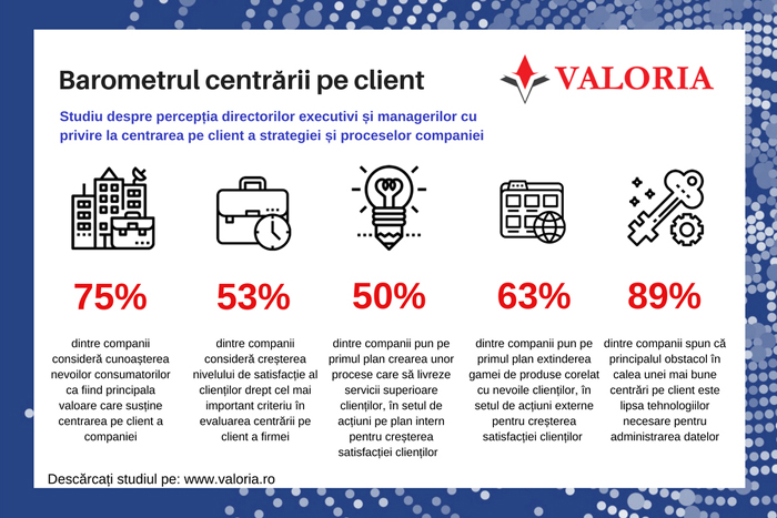 Conform „Barometrului centrarii pe client in companiile din Romania 2017”, un studiu realizat de Valoria in colaborare cu Doingbusiness.ro, 89% dintre companii spun ca principalul obstacol in calea unei mai bune centrari pe client este lipsa tehnologiilor necesare pentru administrarea datelor, chiar daca 75% considera cunoasterea nevoilor consumatorilor ca valoarea esentiala care sustine centrarea pe client a companiei. Mai mult, doar 27% dintre companii au ca valoare retentia consumatorilor.