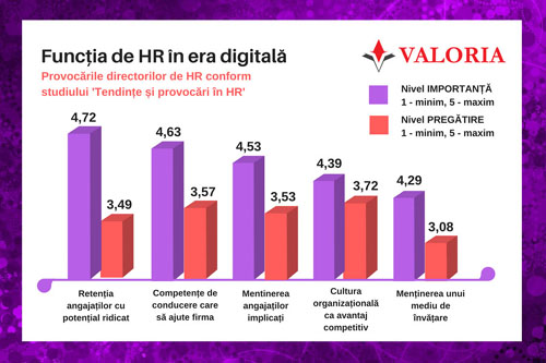 Studiul Valoria Tendinte si provocari in HR sondeaza perceptiile directorilor executivi din top managementul companiilor si ale directorilor de HR cu privire la provocarile strategice care stau in fata functiei de HR. Chestionarul, la care s-au primit 207 raspunsuri, a fost aplicat in perioada la finalul anului 2017, iar raspunsurile la acesta arata discrepante majore intre companii cu privire la aportul staregic al functiunii de HR la dezvoltarea afacerii.