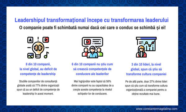 Studii realizate de companii de consultanta globale arata ca 77% dintre organizatii spun ca au un deficit de competente de leadership in acest moment, iar 56% dintre acestea nu au capacitatea de a creste aceste competente la nivelul echipelor lor de conducere. Pe de alta parte doar 27% dintre lideri stiu cum sa transforme cultura organizationala a companiei.