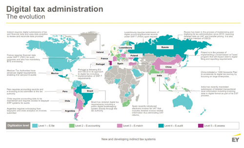 Harta de mai jos evidentiaza situatia curenta privind nivelul digitalizarii autoritatilor fiscale, raportat la nivelul de maturitate digitala al fiecarei tari (1-5).