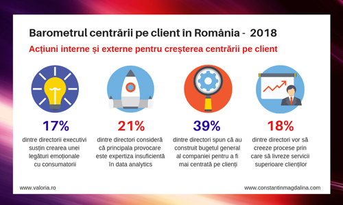 In cazul a 21% dintre directorii care au raspuns la chestionarul studiului principala provocare pentru a avea companii mai bine centrate pe clienti este expertiza insuficienta in data analytics. Procentul creste la 24% in cazul managerilor si scade la 19% in cazul sefilor de departament. Urmatoarea provocare cu procente semnificative este cea legata de lipsa platformelor tehnologice de gestionare a datelor despre clienti.