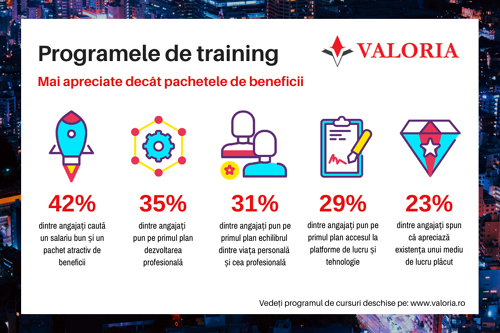 In 2020, multi angajati nu mai cauta doar o slujba. Dar ce vor mai mult? Conform unei cercetari realizate de compania de consultanta Valoria, 42% dintre angajati cauta un salariu bun si un pachet atractiv de beneficii, dar imediat dupa aceea, 35% pun pe primul plan dezvoltarea profesionala. In cazul tinerilor 86% dintre acestia pun pe primul plan dezvoltarea profesionala si numai 47% tin cont in alegerea locului de munca, in principal, de nivelul de salarizare, plus beneficii atractive.