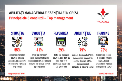 Compania de consultanta Valoria a realizat un studiu ce capteaza perspectiva conducatorilor companiilor in legatura cu situatia generata de pandemia COVID-19 in Romania. Studiul lansat azi de Valoria identifica perceptia acestora asupra contextului actual, asteptarile lor cu privire la durata de recuperare a companiilor dupa aceasta criza si competentele echipei de management esentiale pentru a trece peste provocari cu succes.