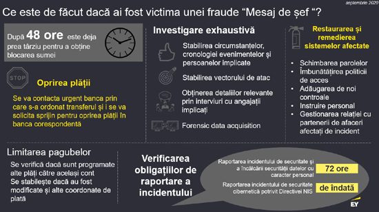 In al doilea rand, se va urmari limitarea pagubei. Mai precis, se va stabili daca sunt programate alte plati catre contul indicat de atacator si daca au fost schimbate recent si alte conturi ale furnizorilor sau angajatilor, catre care ar urma sa se efectueze plata.