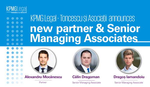 Societatea de avocatura KPMG Legal - Toncescu si Asociatii SPARL anunta cooptarea lui Alexandru Mocanescu ca nou Partener si Coordonator al practicii de Real Estate si ESG incepand cu Octombrie 2021. In acelasi timp, au avut loc doua promovari interne in domenii cheie – Calin Dragoman care a devenit senior managing associate in echipa de Litigii si respectiv Dragos Iamandoiu, care a devenit senior managing associate in echipa de Corporate si M&A - reflectand astfel dezvoltarea sustinuta a societatii in aceste domenii extrem de importante.