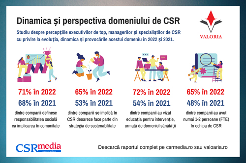 Valoria si CSRMedia.ro au lansat cea de-a zecea editie a studiului ”Dinamica si perspectiva domeniului CSR din Romania”. Acesta este singurul studiu de pe piata autohtona dedicat domeniului CSR care analizeaza tendintele domeniului timp de 10 ani la rand.