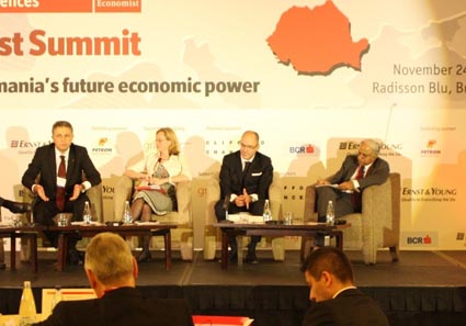 Alexis Karklins-Marchay (foto, in centru), Lider al Centrului Ernst & Young pentru piete emergente din Londra, a vorbit in cadrul The Bucharest Summit despre branding-ul de tara pentru investitorii internationali si despre perspectivele Romaniei de crestere in noua economie: