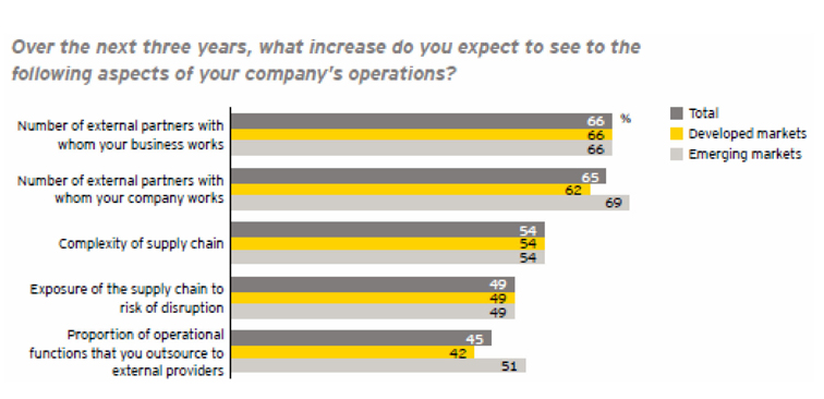 Companiile multinationale fac eforturi sa gaseasca echilibrul intre dimensiunea globala si cea locala, astfel incat sa isi pastreze relevanta pentru consumatorii din fiecare piata. Aceasta abordare se traduce in regandirea intregului model operational intr-un mix care utilizeaza eficient resursele si lanturile de aprovizionare. Complexitatea operatiunilor creste intr-un context in care agilitatea si dinamismul devin foarte importante pentru a face fata volatilitatii pietelor. Din acest motiv, tot mai multe companii opteaza pentru o structura de costuri variabila, care sa le permita realocarea rapida a resurselor si un raspuns prompt la evolutiile din piata. Mai mult decat atat, 66% din respondenti se asteapta la cresterea numarului de colaboratori si furnizori in urma externalizarii unor operatiuni interne, in ciuda expunerii la un nivel crescut de riscuri privind lanturile de aprovizionare.