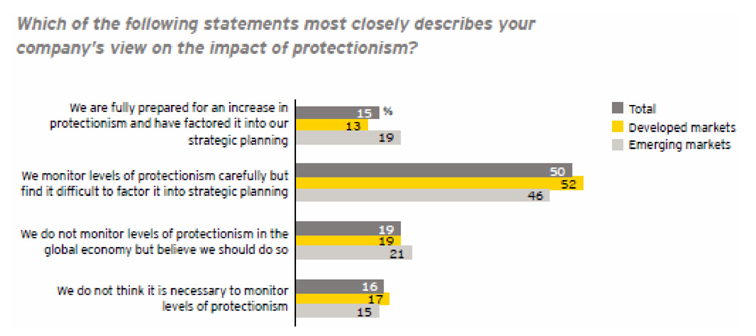 Avand in vedere cat a avut de suferit majoritatea tarilor in urma recesiunii economice globale, este impresionant si de apreciat consensul liderilor politici de a evita masurile protectioniste. Cu toate acestea 90% din executivii intervievati se asteapta ca astfel de masuri sa devina realitate daca recesiunea se adanceste. Surprinzator este faptul ca doar 15% din companii sunt pregatite sa le faca fata, luand in calcul astfel de evolutii in strategiile de business planificate.