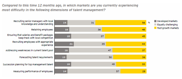 Companiile din intreaga lume spun ca au dificultati tot mai mari in a gasi candidatii potriviti pentru posturile disponibile. Iar aceasta problema este resimtita mai ales in pietele emergente, unde recrutarea resurselor umane specializate si a angajatilor din segmentul mediu si de conducere este mai dificila decat in pietele dezvoltate. Pe de alta parte, desi acorda importanta crescuta investitiilor in pietele cu crestere rapida, companiile multinationale nu se grabesc sa detaseze cei mai talentati oameni in aceste locatii, existand inca perceptia ca nu sunt necesare investitii in resurse umane similare cu cele din pietele mature.